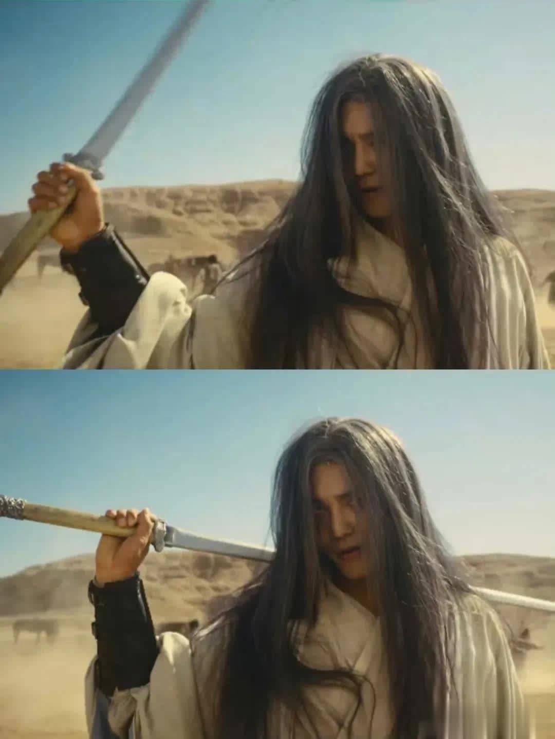 于适以一头极具辨识度的灰白长发造型,饰演年轻剑客竖(玉面鬼)。