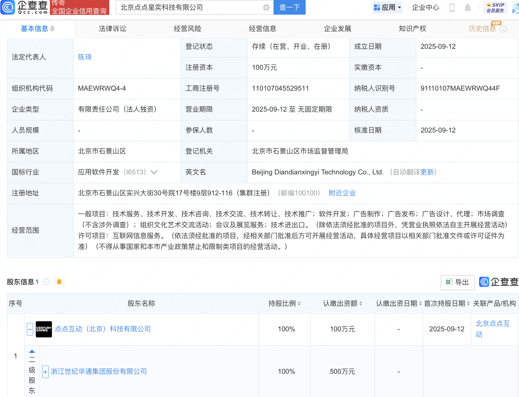 近日,北京点点星奕科技有限公司成立配资知识股,法定代表人为陈琦,经营范围包含:软件开发;广告制作;广告发布;互联网信息服务等。企查查股权穿透显示,该公司由ST华通(002602)间接全资持股。