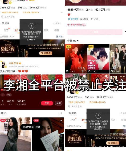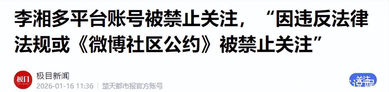 ——【·无预警账号“禁关”·】——2026年1月16日,娱乐圈出了件不算张扬但影响不小的事:前湖南卫视主持人李湘的微博、抖音、小红书等主要社交账号,被同步设置为“禁止关注”。