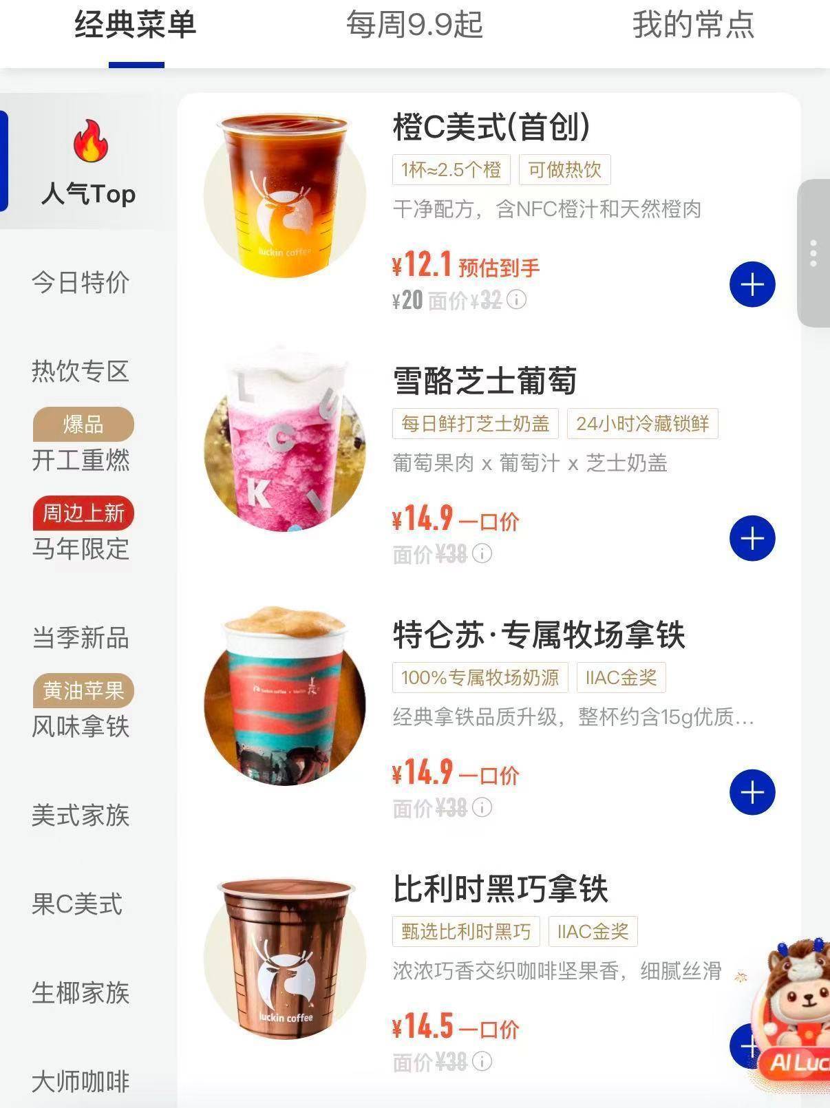 2月初,一直保持全场9.9元的库迪咖啡宣布收缩补贴范围,这意味着9.9块的咖啡再也不是库迪的常态。而瑞幸咖啡则在更早的时间就已经开始收紧9.9元券可用产品数量。蓝鲸新闻记者通过瑞幸咖啡在线点单系统查询发现,大部分饮品单价均位于13到16元价格带。用券后,9.9元单品仅为限定三款。