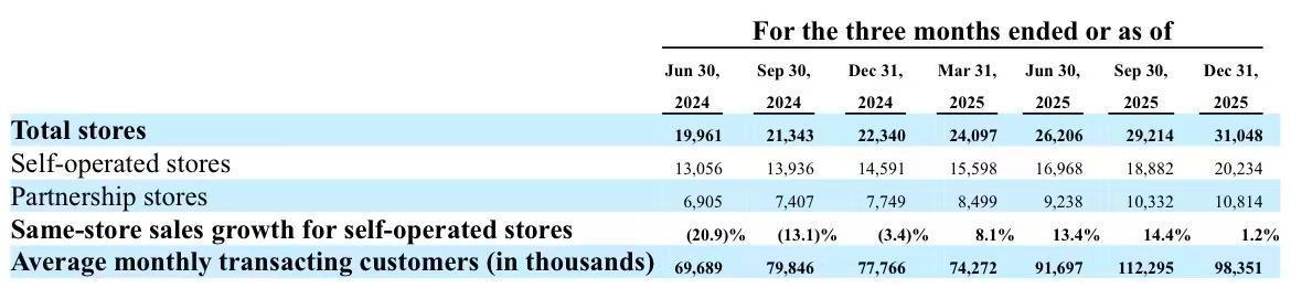 对此,瑞幸咖啡联合创始人、首席执行官郭谨一在业绩会上表示,第四季度的同店销售额和利润表现受到多重因素影响,包括季节性波动、外卖平台调整、补贴政策变化以及杯装产品结构变化。这些因素均符合我们的预期。