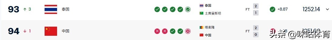 亚洲杯预选赛 D 组第6轮,泰国队在第 89 分钟完成 2-1 绝杀,击败土库曼斯坦惊险晋级亚洲杯正赛。凭借这场胜利,泰国队的 FIFA 即时排名成功反超国足,升至第 93 位。