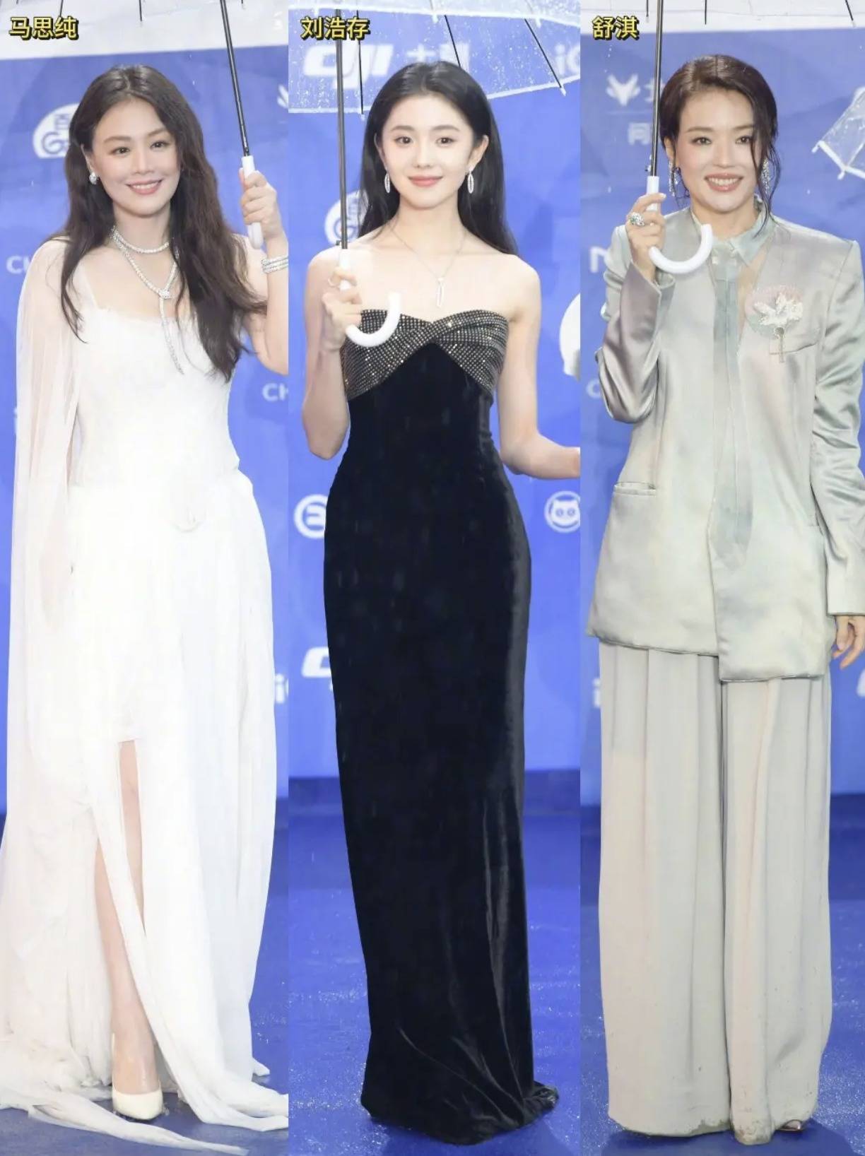 于是,出现了平日里红毯上难得一见的场景:身着高定礼服、化着精致妆容的女明星们纷纷撑起雨伞,有人提起裙子却顾不上雨伞,模样略显狼狈。
